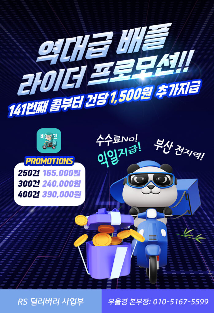 RS 딜리버리 사업부는 이 지역을 중심으로 부산 쿠팡이츠플러스(부산 쿠플)와 부산 배민플러스(부산 배플) 라이더 네트워크를 확장하고 있으며, 현재 부산 내 최다 라이더 프로모션을 운영 중입니다.